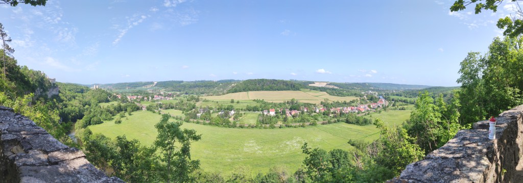 Bei Saaleck führt der Radweg um die Burg Saaleck herum zur Rudelsburg. Der Aufstieg auf der viel befahrenen, schmalen Strasse wird durch den schönen Ausblick über das Saaletal belohnt. Doch die Abfahrt wird streng. Der Weg (offizieller Saaleradweg) gleicht eher einem Bergwanderweg. Wir zirkeln unsere beladenen Esel (oder unsere Karavane, wie wir von Passanten schon liebevoll benannt wurden, über die Steinstufen und fühlen uns wie auf einer Downhillfahrt.