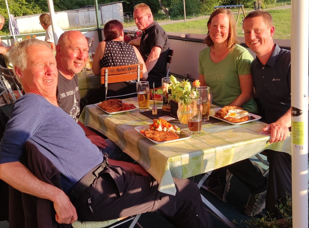 Frisch geduscht sitzen wir bald im Biergarten beim Bootshaus und schlemnen gute Schnitzel und für Petra gibts noch Apfelstrudel. Ein gemütlicher Tag verabschiedet sich mit einem schönen Sonnenuntergang und mit der einkehrenden Nacht verkriechen auch wir uns in unsere Zelte.