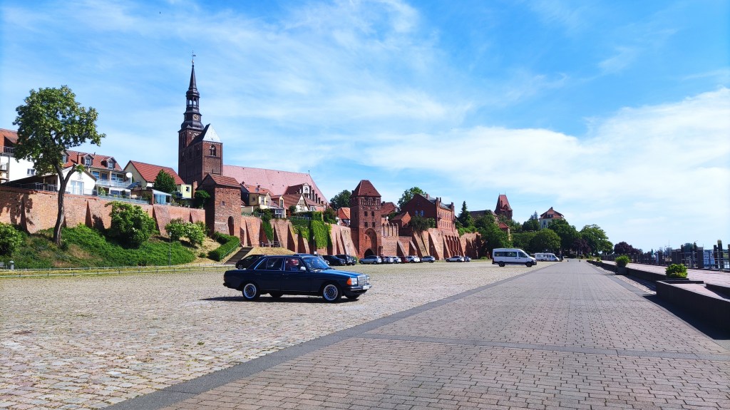 Wir kommen heute sehr gut voran. Es ist merklich flacher geworden. Tangermünde ist von der Elbpromenade her schön anzuschauen. Bei der Weiterfahrt müssen wir leise sein, denn es finden am Quai gerade Dreharbeiten statt. Dies ist aber nicht so einfach, denn über das Kopfsteinpflaster klappert der Inhalt unserer Taschen gehörig.