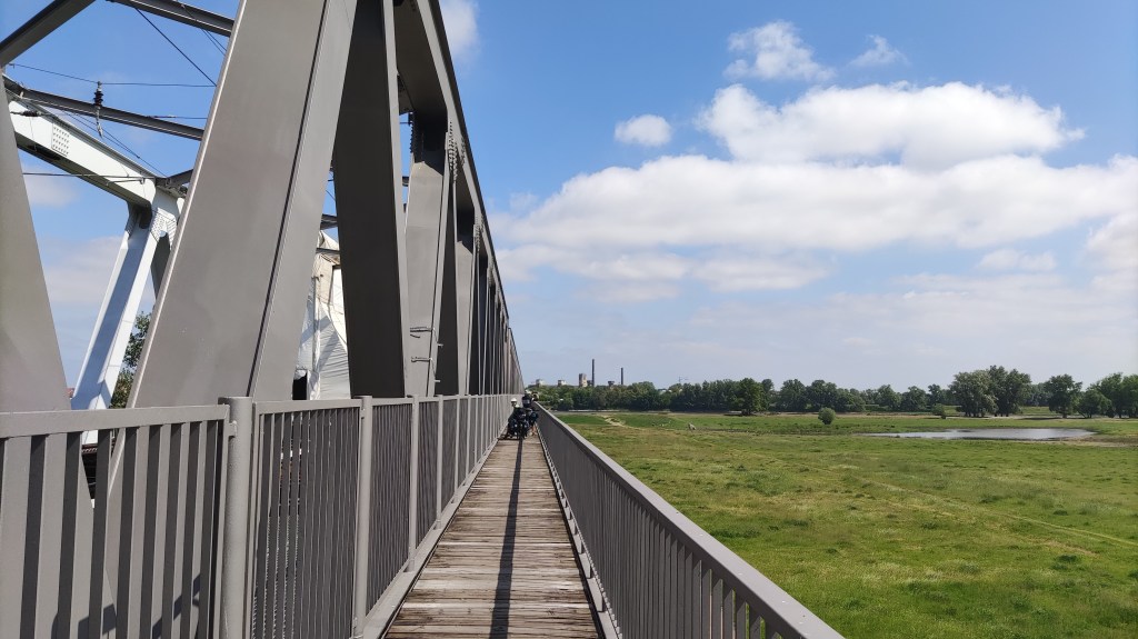Um auf die andere Flussseite zu kommen müssen wir bei Wittenberge über die lange Eisenbahnbrücke das breite Einzugsgebiet der Elbe queren. Von da oben sehen die Landschaften so aus, als blickten wir in die Savanne und es komme im nächsten Moment eine Herde Zebras um die Ecke. Zebras hat es natürlich keine. Aber immer wieder weiden Schafe und Kühe, manchmal bewacht von Herdenschutzhunden.