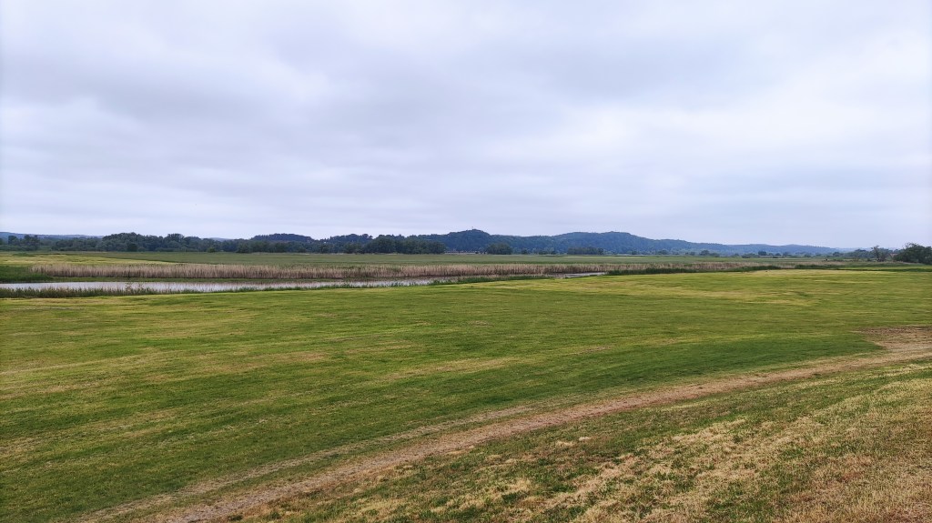 Heute ist der Wind uns gnädig. Nicht selten haben wir ihn von der Seite, was nicht so bremst oder sogar stösst. Zudem ist heute, wo vorhanden, der Dammweg geteert. Ein Auf und Ab gibt es dennoch, da auf dem Damm nicht durchgehend gefahren werden kann. Wir sehen immer wieder Wildtiere. So scheuchen wir zwei Rehe auf, die am Damm grasen und eine Eule schwebt lange vor uns durch eine Allee. Wie das Rehkitz den Mäher überlebt hat, können wir uns nicht erklären. Es steht ganz allein im geschnittenen Gras.