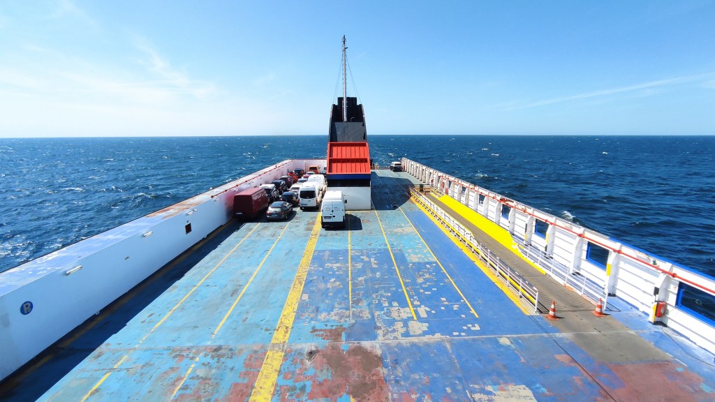 Andere kaufen sich Massagesessel, wir schlafen eine Nacht in der Kabine einer Autofähre. Weichgerüttelt werden wir um 8 Uhr geweckt. Der Lautsprecher begrüsst uns und lädt zum Frühstück ein. Das lassen wir uns nicht entgehen.