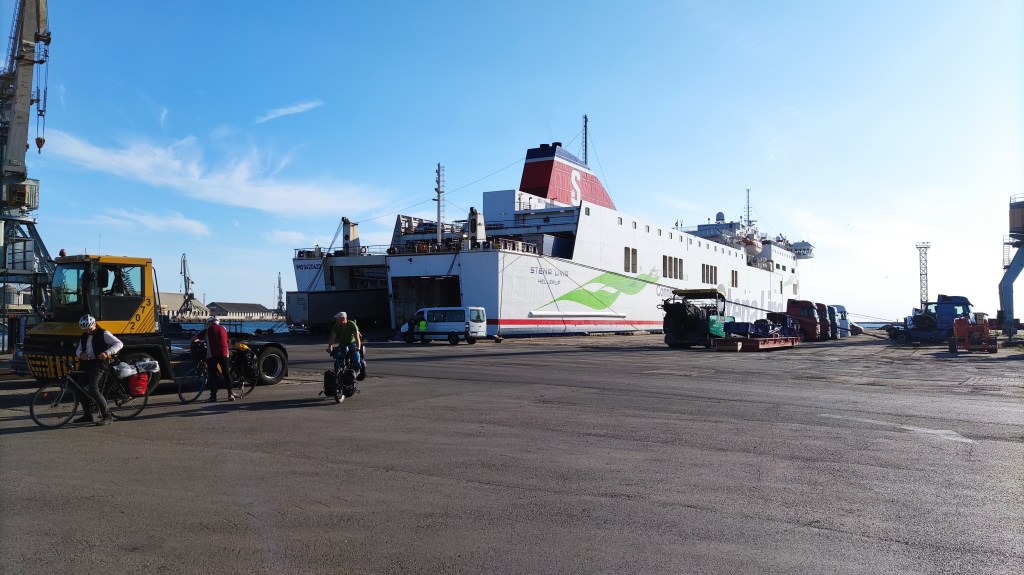 Mitten zwischen Lastwagen, Gabelstapler, Wohnwagen und Motorräder fahren wir vom Schiff und sind froh wieder in die Pedalen treten zu dürfen. Heute sind es aber nur 5 km bis zum BB Camping am Badesee. Noch zu wenige, um sich an die neue Beschilderung zu gewöhnen. Und auf dem Camping erwarten uns die Mücken. Deshalb, und auch weil es in Lettland schon 1h später ist, sind wir schnell im Zelt, wo die Matte zwar nicht mehr rüttelt, aber es bei geschlossenen Augen immer noch schwankt.