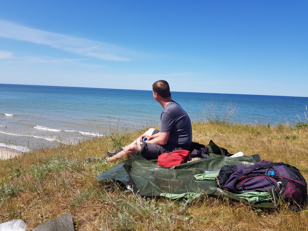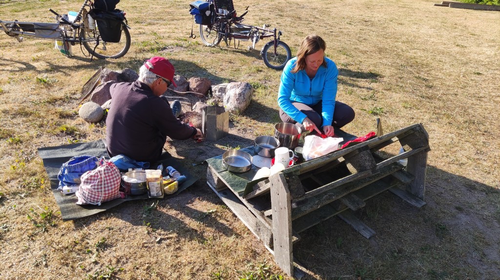 In Jūrkalne können wir einkaufen. Wir tun dies für heute und morgen, da wir nicht sicher sind, ob wir bei unserer Fahrt ins Landesinnere andere Einkaufsmöglichkeiten finden werden. Die Suche nach dem Camping ist etwas schwierig. 1. verstehen wir selten ein Wort auf den Schildern, zweitens ist da nichts offizielles vorhanden. Auf einer grossen Wiese stehen Zelte und wir dürfen da auch aufstellen. Eine öffentliche Toilette gibt es, aber duschen können wir nicht – waschen tuts auch. Hauptsache nicht mehr klebrig.