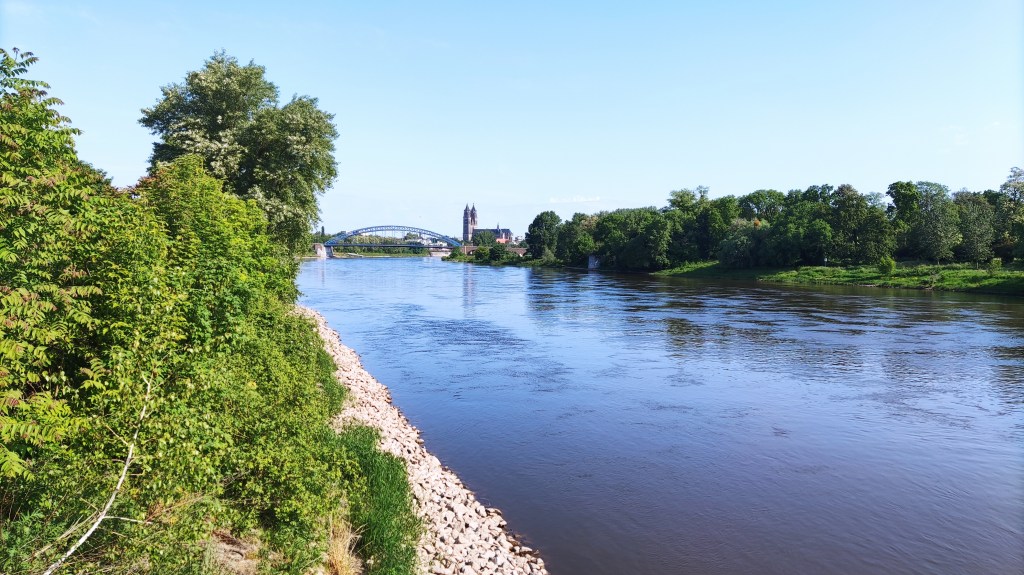 Wir sind froh, dass wir frühzeitig entlang der Magdeburger Promenade fahren, denn bereits jetzt hat es viele Leute. Wir stellen uns vor wie es an diesem schönen Pfingstmontag zwei Stunden später aussehen mag. Entlang der Elbe fahren wir aus der Stadt und gelangen nach den ersten 20 km an das Schifffahrtsweg-Kreuz bei Hohenwarthe. Es ist faszinierend eine Brücke in Form eines Wasserkanals vor sich zu sehen.